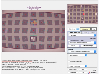(1)將分辨率測(cè)試卡SFRPlus圖像加載到軟件中,并對(duì)其進(jìn)行分析,以確定逆變換算系數(shù)(顯示在Rescharts交互模塊中)。(或者,將圖像加載到Dot Pattern模塊中并從中檢索LGD系數(shù),并將其轉(zhuǎn)換為逆變換系數(shù),然后跟隨其余步驟)。將它們加載到MATLAB中。