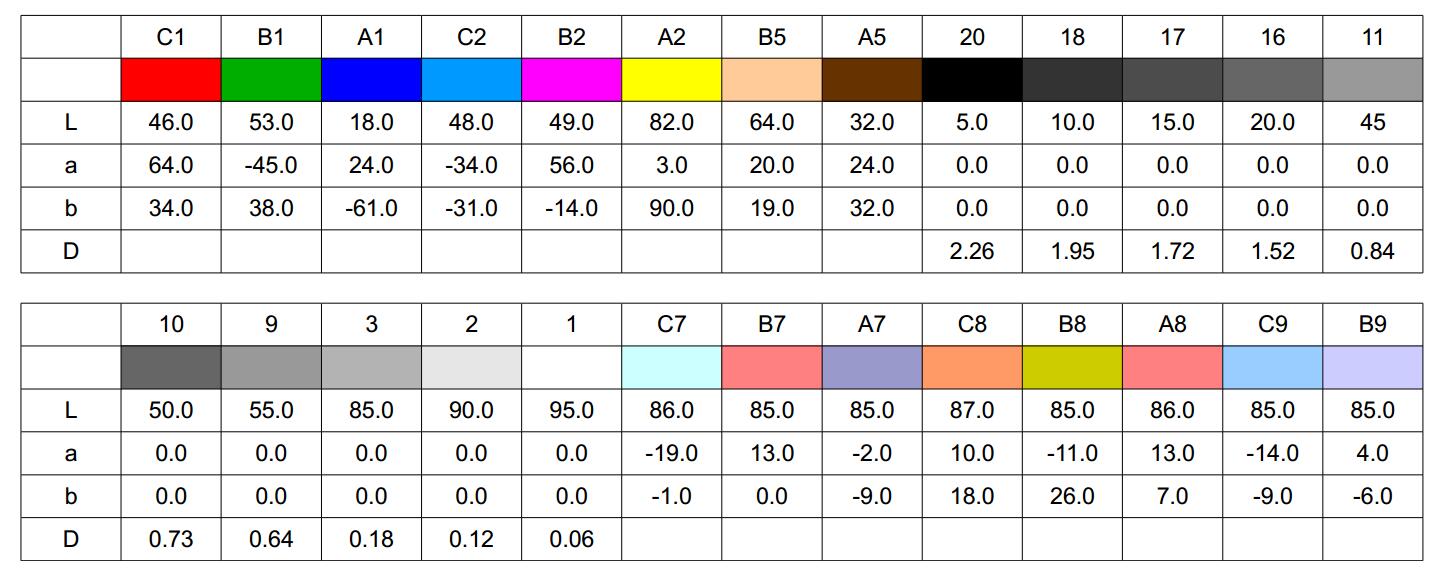 The chart consists of gray steps, color patches, a scale and resolution pattern. It allows automatic analysis of each scanned page and, in combination with the right software, provides information for the purpose of showing when a specific page happens to be out of specs.