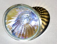 The image at right shows a Solux bulb: Note the blue highlights, and how yellow the light shining through the reflector is. This is how the Solux bulb converts light from an incandescent filament to an accurate daylight balance - It "throws away" much of the yellow light out the back of the bulb, reflecting more of the blue end of the spectrum toward the subject. TLI sells the bulbs as a matter of course, and can probably be coaxed into selling the special sockets as well (as they did for us), even though this isn't their main interest. Overall, if you intend to do this sort of thing commercially, you're probably better off getting their pre-assembled units for $160 each. A word of caution though: The Solux' (or any other incandescent lamp's) color spectrum is a fairly strong function of the filament voltage. You'll thus need to provide some sort of voltage regulation in order to achieve truly repeatable results. If you're looking for a very accurate "daylight simulator" at a reasonable price, we'll happily plug TLI's bulbs - they've worked great for us!